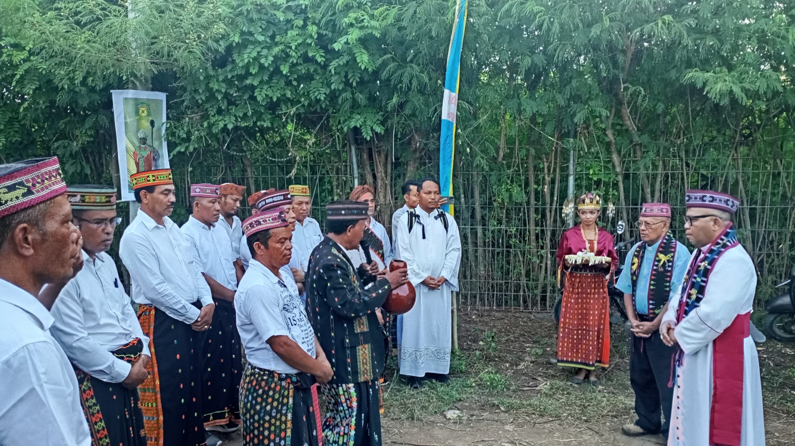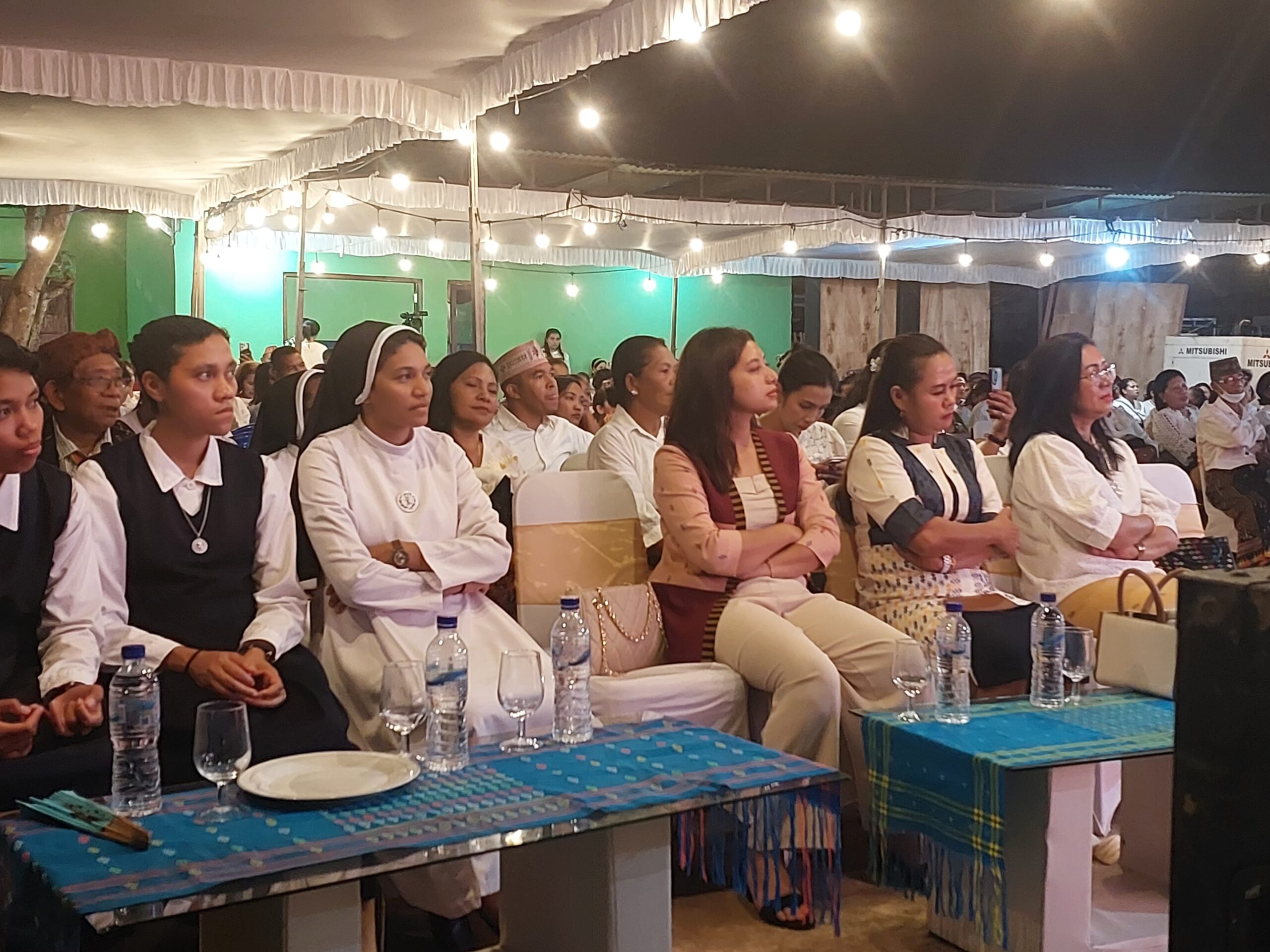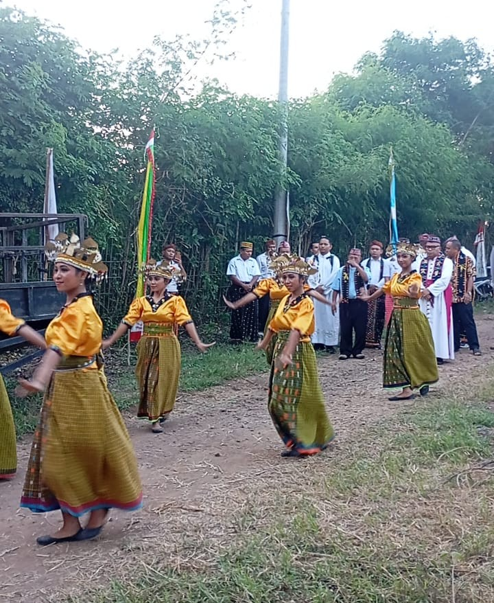 Sebelumnya, Uskup dan rombongan diterima secara adat berupa Kepok dan  tuak curu serta manuk kapu yang dibawakan bapa Lambert Jeharu dan bapa Viktor Raul. Rombongan didampingi  Ketua Panitia Bapak Beni Rana Lebar, kemudian   diantar dengan tarian dari anak-anak Sanggar Seni Ta Te KinD Art. Beberapa lagu dalam perayaan ekaristi diiringi juga dengan tarian. Koor oleh paduan suara dari Wilayah 1 dengan dirigen Tomi Lokang dan organis Kornelis Joni.